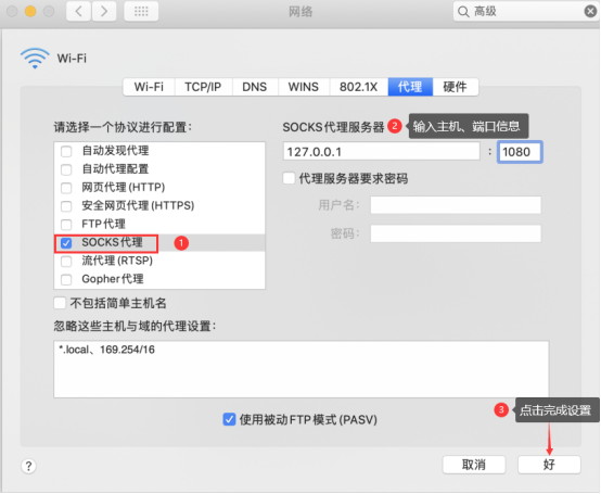 点击“代理”→选择“SOCKS代理”→输入主机、端口信息→点击 “好”,完成设置